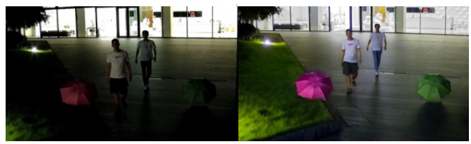 簡單地說,星光技術(shù)依賴圖像傳感器,黑光依賴補(bǔ)光,AI超微光依賴于算法,因此在成像中,都會(huì)有一定的偏差:星光技術(shù)由于采用星光級(jí)圖像傳感器,大光圈鏡頭,雖然可以擴(kuò)大進(jìn)光量,但也降低了圖像的景深,如果應(yīng)用在交通卡口場景,仍需快速抓拍移動(dòng)的人與物,因此也對(duì)快門速度有一定要求,如果處理不當(dāng)也容易抓拍無效圖片;黑光技術(shù)采用紅外補(bǔ)光+LED暖光補(bǔ)光雙光結(jié)合方案,容易受外物所影響,例如汽車玻璃上粘貼了防爆膜,人物穿著反紅外的衣服等,都可以造成色彩失真。